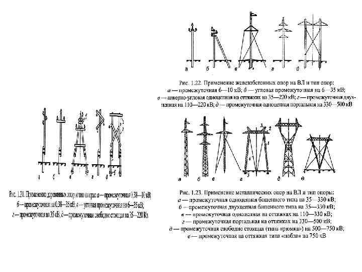 опоры: • промежуточные, предназначенные для поддержания проводов на прямых участках линий. Они не имеют жесткой связи с проводом, не воспринимают тяжения проводов и являются точкой опоры подвеса провода, который крепится к опоре с помощью гирлянды изоляторов; • анкерные, имеющие более жесткую и прочную конструкцию, чтобы воспринимать продольные усилия от разности натяжения по проводам и поддерживать (в случае обрыва) все оставшиеся в анкерном пролете провода. Анкерные опоры подразделяются: • на концевые, устанавливаемые в начале и конце линии, должны выдерживать постоянно действующее одностороннее натяжение проводов; • угловые, устанавливаемые в местах изменения направления трассы. Эти опоры укрепляются подкосами или металлическими оттяжками; • специальные следующих типов переходные, ответвительные