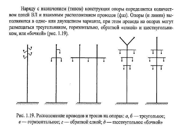 опоры: • промежуточные, предназначенные для поддержания проводов на прямых участках линий. Они не имеют жесткой связи с проводом, не воспринимают тяжения проводов и являются точкой опоры подвеса провода, который крепится к опоре с помощью гирлянды изоляторов; • анкерные, имеющие более жесткую и прочную конструкцию, чтобы воспринимать продольные усилия от разности натяжения по проводам и поддерживать (в случае обрыва) все оставшиеся в анкерном пролете провода. Анкерные опоры подразделяются: • на концевые, устанавливаемые в начале и конце линии, должны выдерживать постоянно действующее одностороннее натяжение проводов; • угловые, устанавливаемые в местах изменения направления трассы. Эти опоры укрепляются подкосами или металлическими оттяжками; • специальные следующих типов переходные, ответвительные
