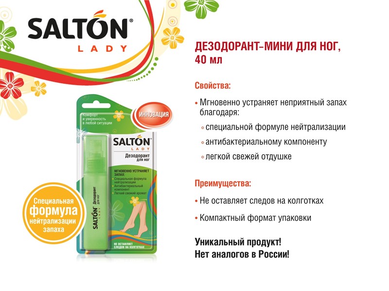 О ТМ SALTON Lady SALTON Lady - линейка средств под известным брендов SALTON, создана специально для комфортного ношения женской модельной обуви ПОЗИЦИОНИРОВАНИЕ: SALTON Lady - легкая и уверенная походка в течение всего дня