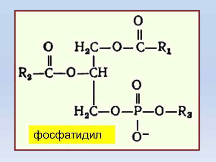 Строение основных глицерофосфолипидов [по А. Леви и Ф. Сикевиц, 1971] фосфатидил Название Радикал R 1 Радикал R 2 Радикал R 3 Фосфатидная кислота Жирная кислота -Н Фосфатидилхолин (лецитин) Жирная кислота холин Фосфатидил этаноламин Жирная кислота этаноламин Фосфатидилсерин Жирная кислота серин Фосфатидилинозит Жирная кислота инозит