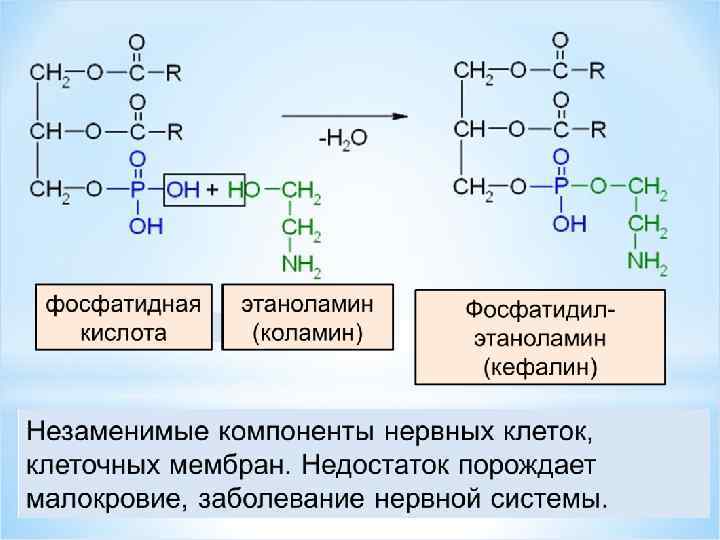 Фосфотидилсерин, кефалин, лецитин вместе с холестерином формируют липидный бислой клеточных мембран, регулируют активность мембранных ферментов, вязкость и проницаемость мембран. Фосфотидилхолин (лецитин) – участвует в образовании желчи и поддерживает находящийся в ней холестерин в растворенном состоянии.