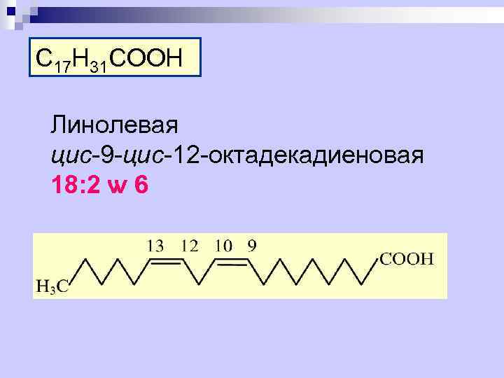 C 17 H 31 COOH Линолевая цис-9 -цис-12 -октадекадиеновая 18: 2 ѡ 6