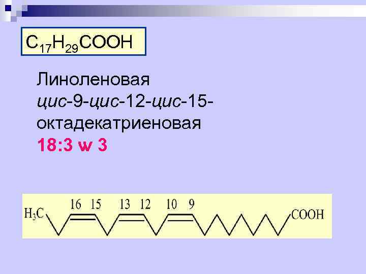 C 17 H 29 COOH Линоленовая цис-9 -цис-12 -цис-15 октадекатриеновая 18: 3 ѡ 3