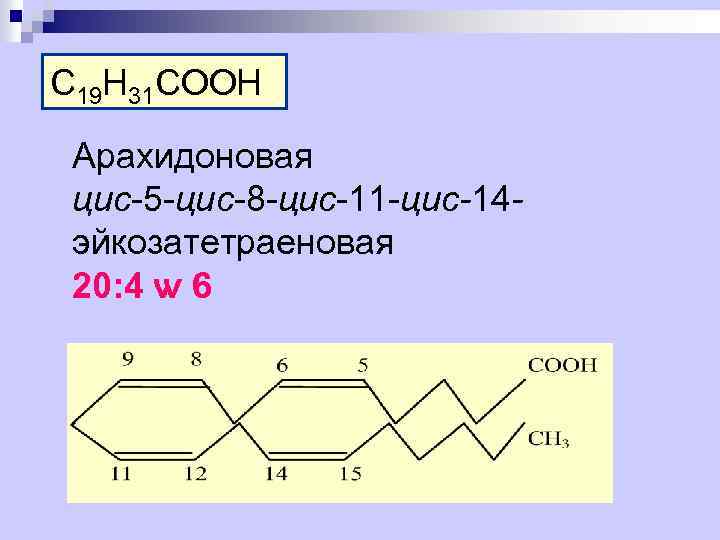 C 19 H 31 COOH Арахидоновая цис-5 -цис-8 -цис-11 -цис-14 эйкозатетраеновая 20: 4 ѡ 6