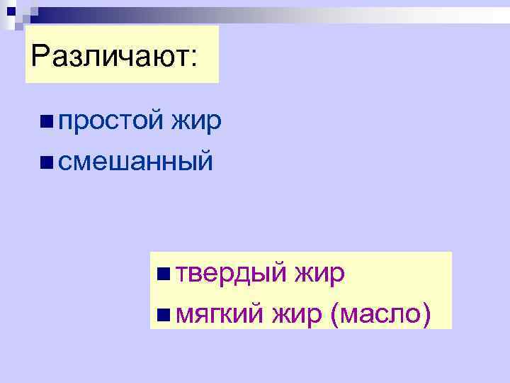 Различают: n простой жир n смешанный n твердый жир n мягкий жир (масло)