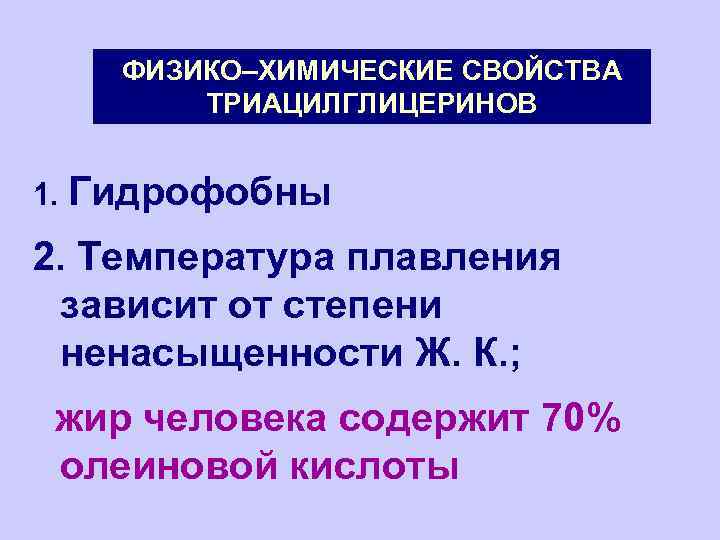 ФИЗИКО–ХИМИЧЕСКИЕ СВОЙСТВА ТРИАЦИЛГЛИЦЕРИНОВ 1. Гидрофобны 2. Температура плавления зависит от степени ненасыщенности Ж. К. ; жир человека содержит 70% олеиновой кислоты