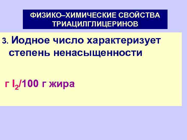 ФИЗИКО–ХИМИЧЕСКИЕ СВОЙСТВА ТРИАЦИЛГЛИЦЕРИНОВ 3. Иодное число характеризует степень ненасыщенности г I 2/100 г жира