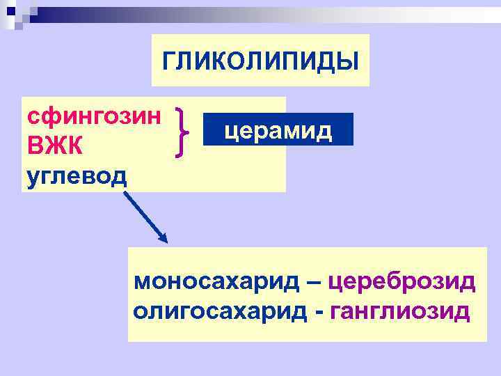 ГЛИКОЛИПИДЫ сфингозин ВЖК углевод церамид моносахарид – цереброзид олигосахарид - ганглиозид