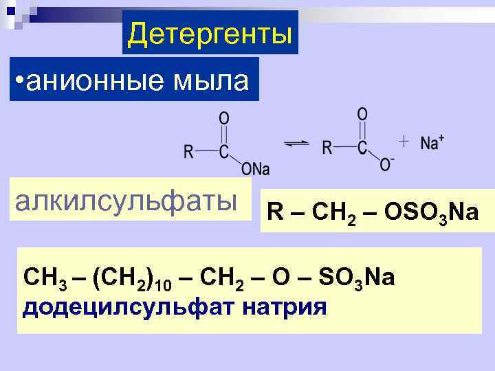 Детергенты • анионные мыла алкилсульфаты R – CH – OSO Na 2 3 CH 3 – (CH 2)10 – CH 2 – O – SO 3 Na додецилсульфат натрия