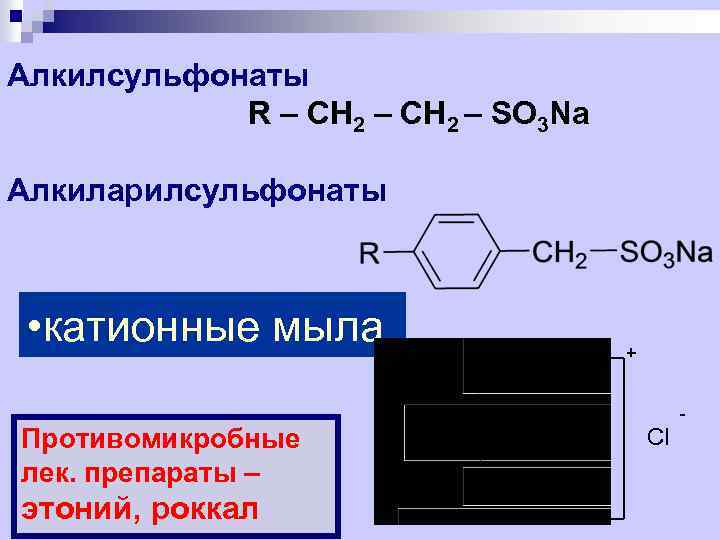 Алкилсульфонаты R – CH 2 – SO 3 Na Алкиларилсульфонаты • катионные мыла + - Противомикробные лек. препараты – этоний, роккал Cl