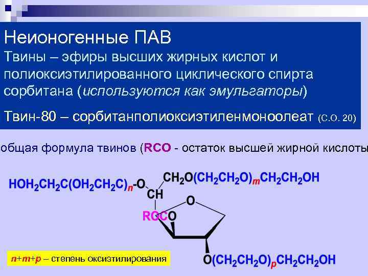 Неионогенные ПАВ Твины – эфиры высших жирных кислот и полиоксиэтилированного циклического спирта сорбитана (используются как эмульгаторы) Твин-80 – сорбитанполиоксиэтиленмоноолеат (С. О. 20) общая формула твинов (RCO - остаток высшей жирной кислоты n+m+p – степень оксиэтилирования