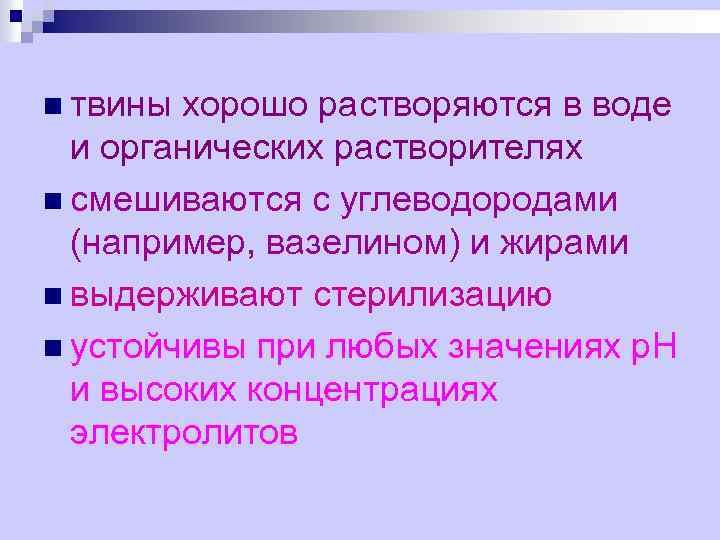 n твины хорошо растворяются в воде и органических растворителях n смешиваются с углеводородами (например, вазелином) и жирами n выдерживают стерилизацию n устойчивы при любых значениях р. Н и высоких концентрациях электролитов