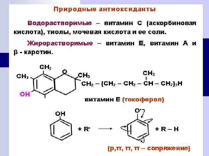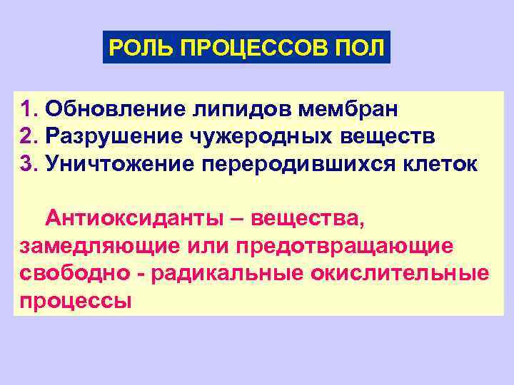 РОЛЬ ПРОЦЕССОВ ПОЛ 1. Обновление липидов мембран 2. Разрушение чужеродных веществ 3. Уничтожение переродившихся клеток Антиоксиданты – вещества, замедляющие или предотвращающие свободно - радикальные окислительные процессы