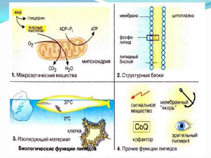 Биологические функции липидов: - структурная; - регуляторная (будучи одним из основных компонентов биологических мембран, липиды влияют на их проницаемость); - электроизоляционная (участвуют в передаче нервного импульса, создании межклеточных контактов); - энергетическая (служат весьма эффективным источником энергии при непосредственном использовании 1 г – 9, 1 ккал. ); - резервная (потенциальный источник энергии – в форме запасов жировой ткани);