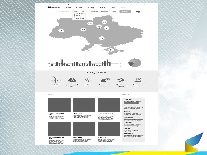 Веб-сайт проектів міжнародної допомоги в Україні • Веб-сайт надасть повний доступ до інформації – бази даних усіх проектів донорів в Україні + створить можливість відображати проекти міжнародної технічної допомоги у формі мапи. • Веб сайт забезпечить прозорість у питаннях міжнародної допомоги: буде наочно показано усі проекти, які суми і кому перераховано, бажаючі матимуть змогу ознайомитися зі звітами проектів, слідкувати за оголошеннями про гранти, тендери, тощо. Наприклад, якщо представник малого чи середнього бізнесу зайде на сайт і захоче знайти інформацію проекти МСП, використовуючи фільтр, користувач зможе відслідкувати у яких областях є подібні проекти, хто, від кого і на що конкретно отримав кошти.