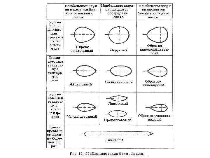 Основные признаки при описании листовых пластинок: общая форма, форма верхушки и основания, расчлененность, особенности края, опушение, характер поверхности, жилкование и др. При описании общей формы пластинки учитывают 2 признака: 1) соотношение длины и ширины; 2) расположение наиболее широкой части (посередине, либо выше или ниже середины).