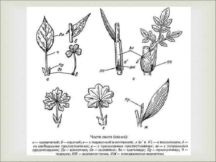 Морфология листа Взрослый лист обычно расчленен на пластинку, черешок и основание. Часто у основания заметны разного размера и формы прилистники. Пластинка - расширенная плоская часть листа. Именно здесь происходит фотосинтез. Черешок - узкая стеблевидная часть между пластинкой и основанием листа. Служит для ориентировки листа по отношению к свету и ослабляет удары по листовой пластине дождя, града, ветра. Листья с черешками - черешчатые, без черешков - сидячие. Основание - базальная часть листа, соединенная со стеблем. У многих растений основание сильно разрастается и охватывает в виде трубки междоузлие или его часть. Такое разросшееся основание называют влагалищем. Влагалище защищает пазушные почки и молодые основания междоузлий.
