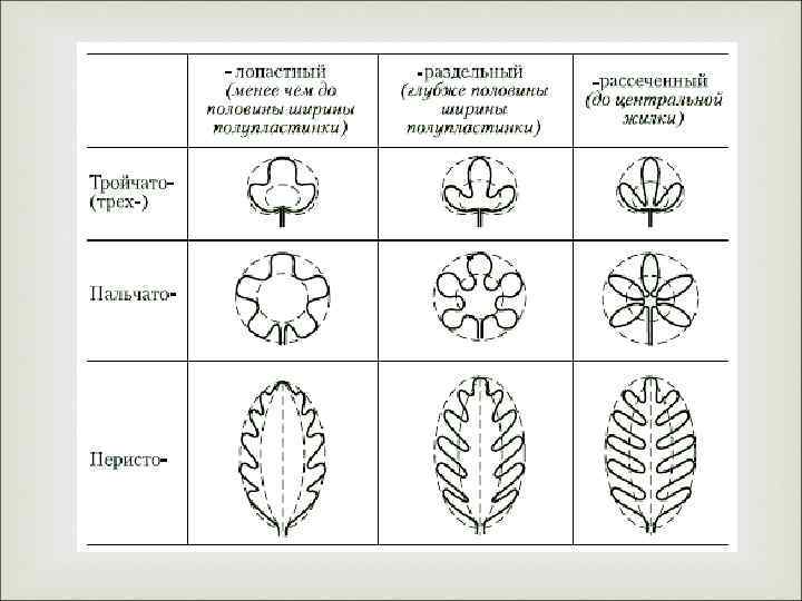 Листовая пластинка может быть цельной или рассеченной (пальчато или перисто). Встречаются дважды-, трижды- и многократно рассеченные листовые пластинки. Сильная изрезанность дает возможность при большой поверхности предохранить лист от разрыва.