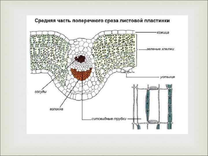 Проводящая система листа В проводящих пучках листовой пластинки ксилема обращена к верхней поверхности листа, а флоэма - к нижней. В проводящих пучках, в ксилеме располагаются трахеи, а во флоэме - ситовидные трубки. В мелких пучках трахеи сменяются трахеидами, во флоэме - паренхимными клетками. Окончания жилок состоят из одной-двух трахеид. Проводящие пучки не примыкают к клеткам мезофилла. Обычно они окружены обкладкой из паренхимы - окаймляющей паренхимой. Наличие обкладки увеличивает область контакта между мезофиллом и проводящими элементами ксилемы и флоэмы.