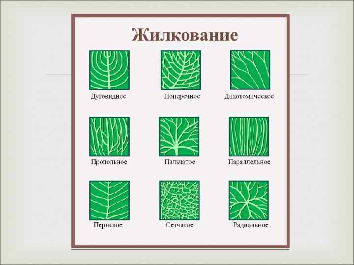 Основные типы жилкования: Дихотомическое жилкование свойственно большинству папоротниковидных, а из голосеменных - гинкго двулопастному. При этом анастомозы отсутствуют, а окончания жилок подходят к краю листовой пластинки. Параллельное и дуговое жилкование характерно для однодольных. При этом от основания листа в пластинку вступает ряд жилок примерно одинакового размера, которые пронизывают пластинку параллельно или дугообразно. На протяжении пластинки жилки соединяются анастомозами, идущими косо.