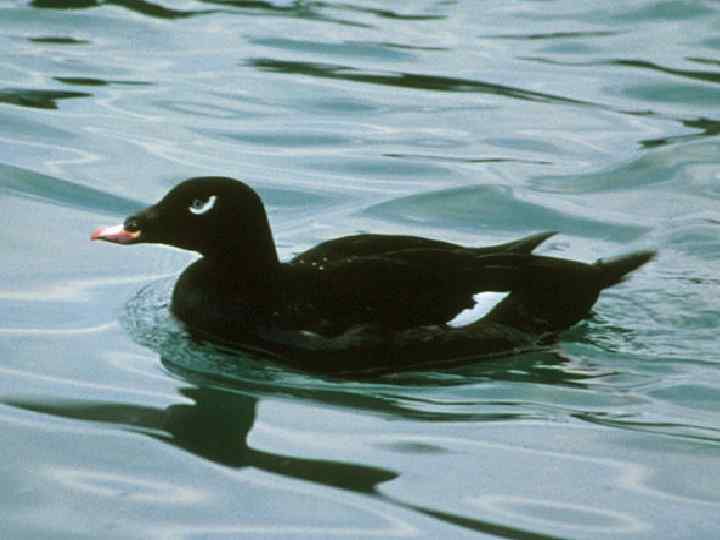The white-winged scoter is the largest of the three North American scoter species. It is characterised by its bulky shape and large bill. This is the largest species of scoter. Females range from 48– 56 cm. She is brown with pale head patches. The male ranges from 53– 60 cm. He is all black, except for white around the eye and a white speculum.