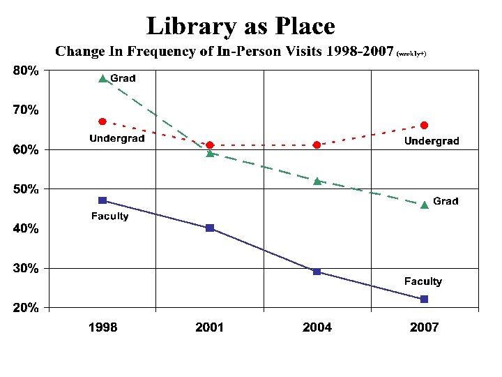 Takeaways after 16 Years • Undergraduates – Library as Place – Work, meet, learn, live • Graduate/professional students – Access to information and services – How can the library save me time? • Faculty – Collections (physical and virtual)