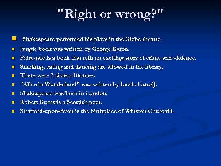 "Right or wrong? " n Shakespeare performed his plays in the Globe theatre. n n n n Jungle book was written by George Byron. Fairy-tale is a book that tells an exciting story of crime and violence. Smoking, eating and dancing are allowed in the library. There were 3 sisters Brontee. "Alice in Wonderland" was written by Lewis Carrol. J. Shakespeare was born in London. Robert Burns is a Scottish poet. Stratford-upon-Avon is the birthplace of Winston Churchill.