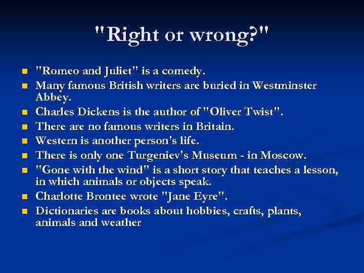 "Right or wrong? " n n n n n "Romeo and Juliet" is a comedy. Many famous British writers are buried in Westminster Abbey. Charles Dickens is the author of "Oliver Twist". There are no famous writers in Britain. Western is another person's life. There is only one Turgeniev's Museum - in Moscow. "Gone with the wind" is a short story that teaches a lesson, in which animals or objects speak. Charlotte Brontee wrote "Jane Eyre". Dictionaries are books about hobbies, crafts, plants, animals and weather