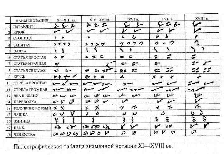 В Древней Руси не было нот, знаки, например > — голубчик, / — палка, V — крюк и другие, ставились непосредственно в текстах богослужебных книг. С увеличением количества знаков создавались певческие азбуки.