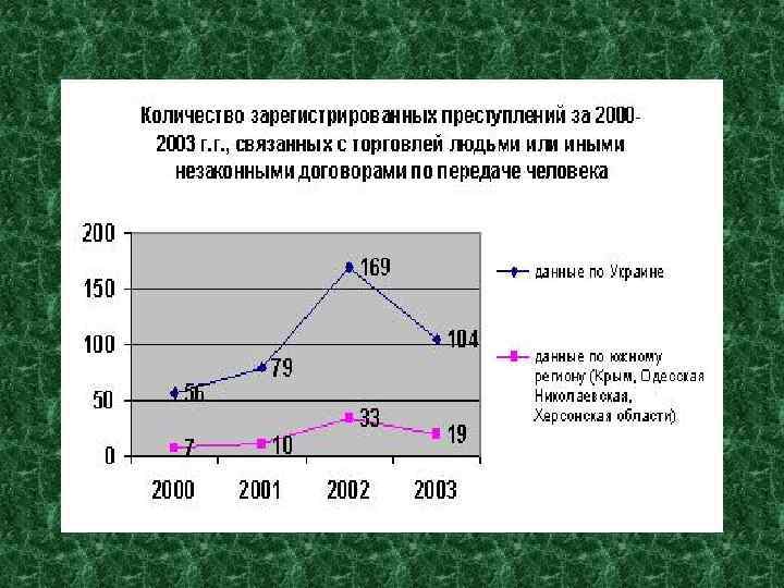 Для Украины и других стран актуальна проблема торговли женщинами с целью их дальнейшей сексуальной эксплуатации. Организация по защите прав человека оценивают число украинских женщин, содержащихся в сексуальном рабстве в Европе, примерно в 100 000. Лишь 15% из них знали, что их ждет, остальные 85% верили, что получают работу официанток, танцовщиц, горничных и т. д. Доказано, почти треть «живого товара» , предназначенного для секс-индустрии Италии, прибывает с Украиной благодаря международным преступным группировкам.