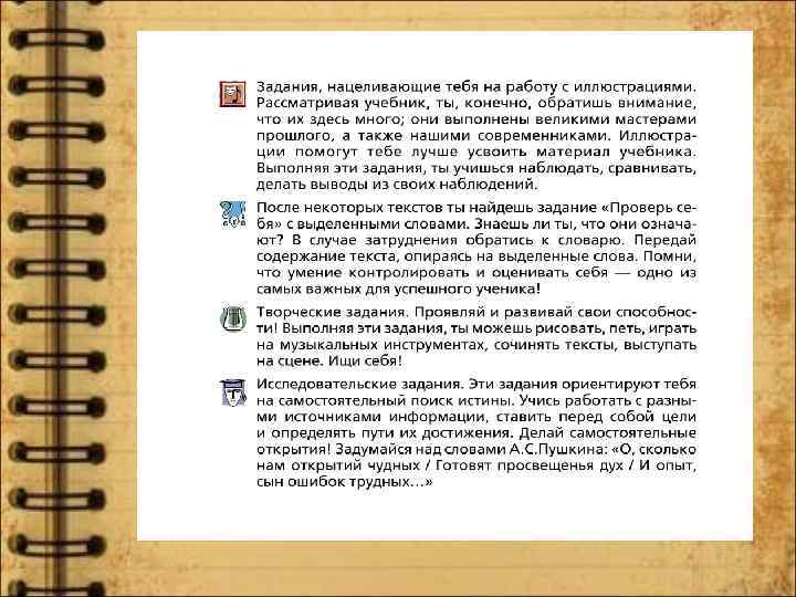 • вопросы и задания, нацеливающие на работу с иллюстрациями, формирующие умение воспринимать и интерпретировать поликодовый текст; • задания, развивающие речевые умения; особая роль отведена словарной работе: выделение ключевых слов текста, их толкование, включение в активный словарь; • задания-проекты, задания-исследования, которые ориентируют на самостоятельный поиск истины, учат работать с разными источниками информации, ставить перед собой цели и определять пути их достижения;