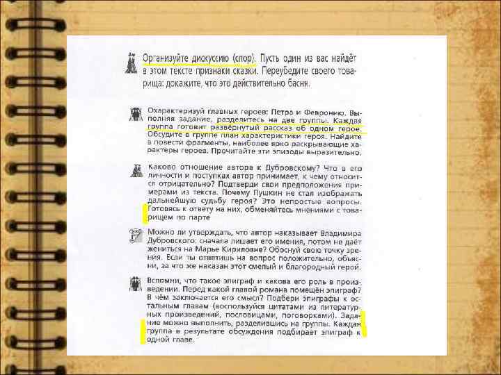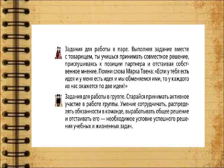 Формулировки всех вопросов и заданий в учебниках содержат алгоритм их выполнения, определяют последовательность действий для достижения цели. Многие задания предусматривают возможность выбора учащимся формы их выполнения (письменно или устно, самостоятельно или в паре, с предварительной подготовкой или без нее).