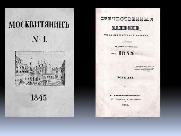 «Маяк» − русский литературный журнал XIX века, выходивший в 1840— 1845. Полное название «Маяк современного просвещения и образованности. Труды учёных и литераторов, русских и иностранных» , с 1842 — «Маяк, журнал современного просвещения, искусства и образованности в духе русской народности» . . . «Москвитянин» − «учёно-литературный журнал» , издававшийся в Москве М. П. Погодиным в 1841— 1856. До 1849 выходил ежемесячно, позднее — два раза в месяц. Сотрудниками Погодина были С. П. Шевырёв, И. И. Давыдов, Ф. Н. Глинка, В. И. Даль и другие. . . «Отечественные записки» − русский литературный журнал XIX века, оказавший значительное влияние на движение литературной жизни и развитие общественной мысли в России; выходил в Санкт-Петербурге в 1818— 1884 годах (с перерывами). . .