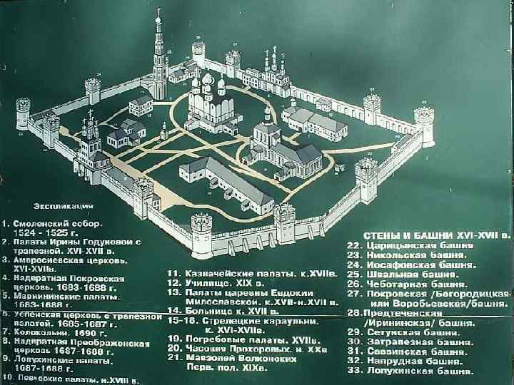 • Основные здания, прославившие монастырь, были возведены в 80 х годах XVII века при деятельном участии царевны Софии. • Основные здания построены по центральной оси (с запада на восток) — трапезная, собор, а на востоке от него — колокольня. • С юга и севера от собора были поставлены надвратные многоглавые церкви — Преображенская и Покровская. Они расположены на трехпролетном арочном основании — своего рода триумфальных арках.