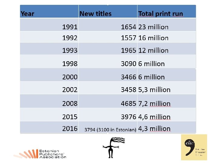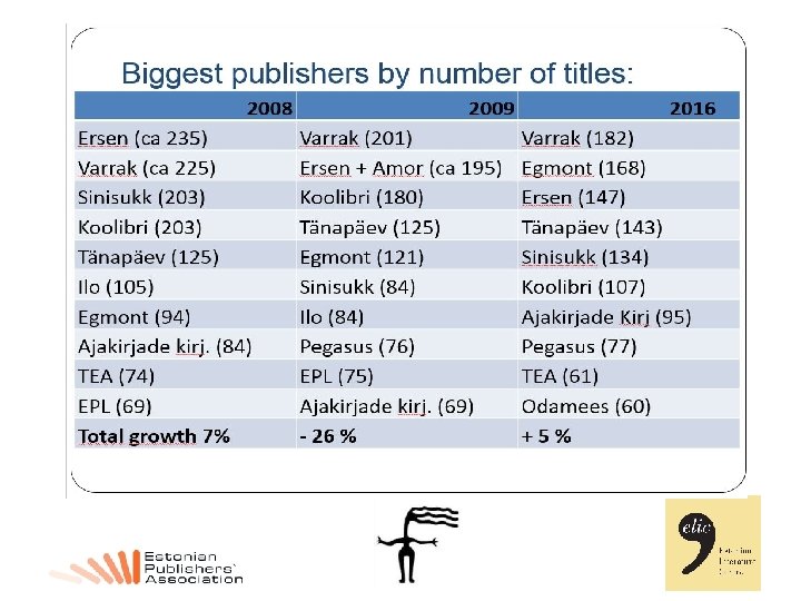 Financial data • By turnover biggest publishers are (2016 estimates): - Avita 3, 8 mln euros (3, 5 in 2008) (textbooks) - Koolibri ca 3, 6 mln (3, 5 in 2008) (mainly textbooks) - Varrak ca 3, 5 million (regular publisher, ca 30% turnover from bookclub + some retail shops) - Egmont ca 1, 5 mln (co-editions, mainly for children) - Tänapäev ca 1, 1 mln • During 2009 economic crisis sales dropped 20– 40% for different companies