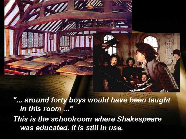 ". . . around forty boys would have been taught in this room. . . " This is the schoolroom where Shakespeare was educated. It is still in use.