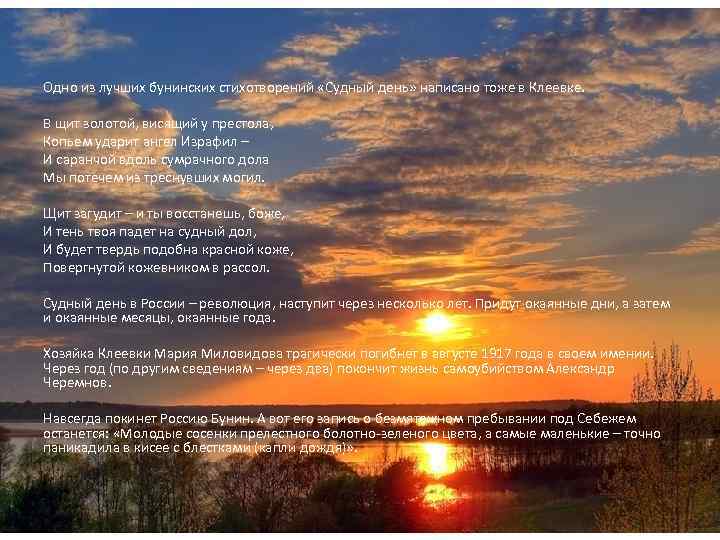 Одно из лучших бунинских стихотворений «Судный день» написано тоже в Клеевке. В щит золотой, висящий у престола, Копьем ударит ангел Израфил – И саранчой вдоль сумрачного дола Мы потечем из треснувших могил. Щит загудит – и ты восстанешь, боже, И тень твоя падет на судный дол, И будет твердь подобна красной коже, Повергнутой кожевником в рассол. Судный день в России – революция, наступит через несколько лет. Придут окаянные дни, а затем и окаянные месяцы, окаянные года. Хозяйка Клеевки Мария Миловидова трагически погибнет в августе 1917 года в своем имении. Через год (по другим сведениям – через два) покончит жизнь самоубийством Александр Черемнов. Навсегда покинет Россию Бунин. А вот его запись о безмятежном пребывании под Себежем останется: «Молодые сосенки прелестного болотно-зеленого цвета, а самые маленькие – точно паникадила в кисее с блестками (капли дождя)» .