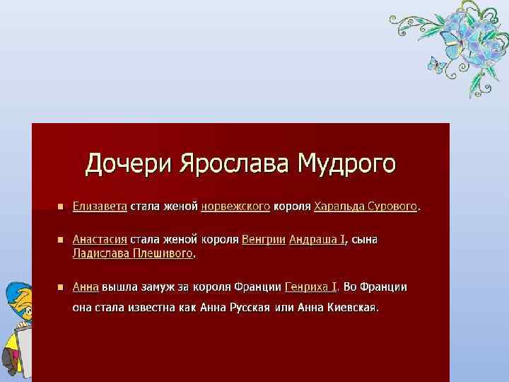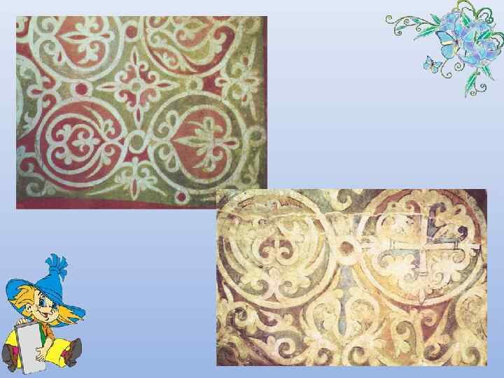 1 Орнамент 1 2 Зверь нападает на всадника 3 Орнамент 2 4 Групповой портрет дочерей Ярослава Мудрого 5 Михайловский придел 6 Борьба ряженых 7 Музыкант 8 Скоморохи 9 Орнамент 3