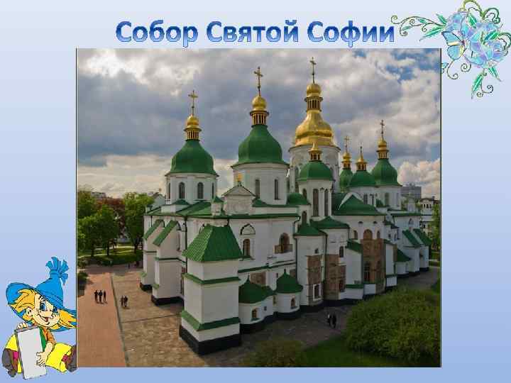 • заложен в 1037 году великим русским князем Ярославом Мудрым, в честь 50 -летия принятия христианства на Руси, сохранил до наших дней не только богатство древней архитектуры, но и живописное убранство XI века. В Софии Киевской гармонично сочетаются два вида монументальной живописи — мозаики и фрески. Мозаики выделяют главные части интерьера — центральный купол и алтарь. Все остальное пятинефное пространство, вторые этажи, обе лестничные клетки и открытые галереи были украшены фресками. До наших дней сохранилось 260 квадратных метров мозаик и около трех тысяч квадратных метров фресковой росписи.