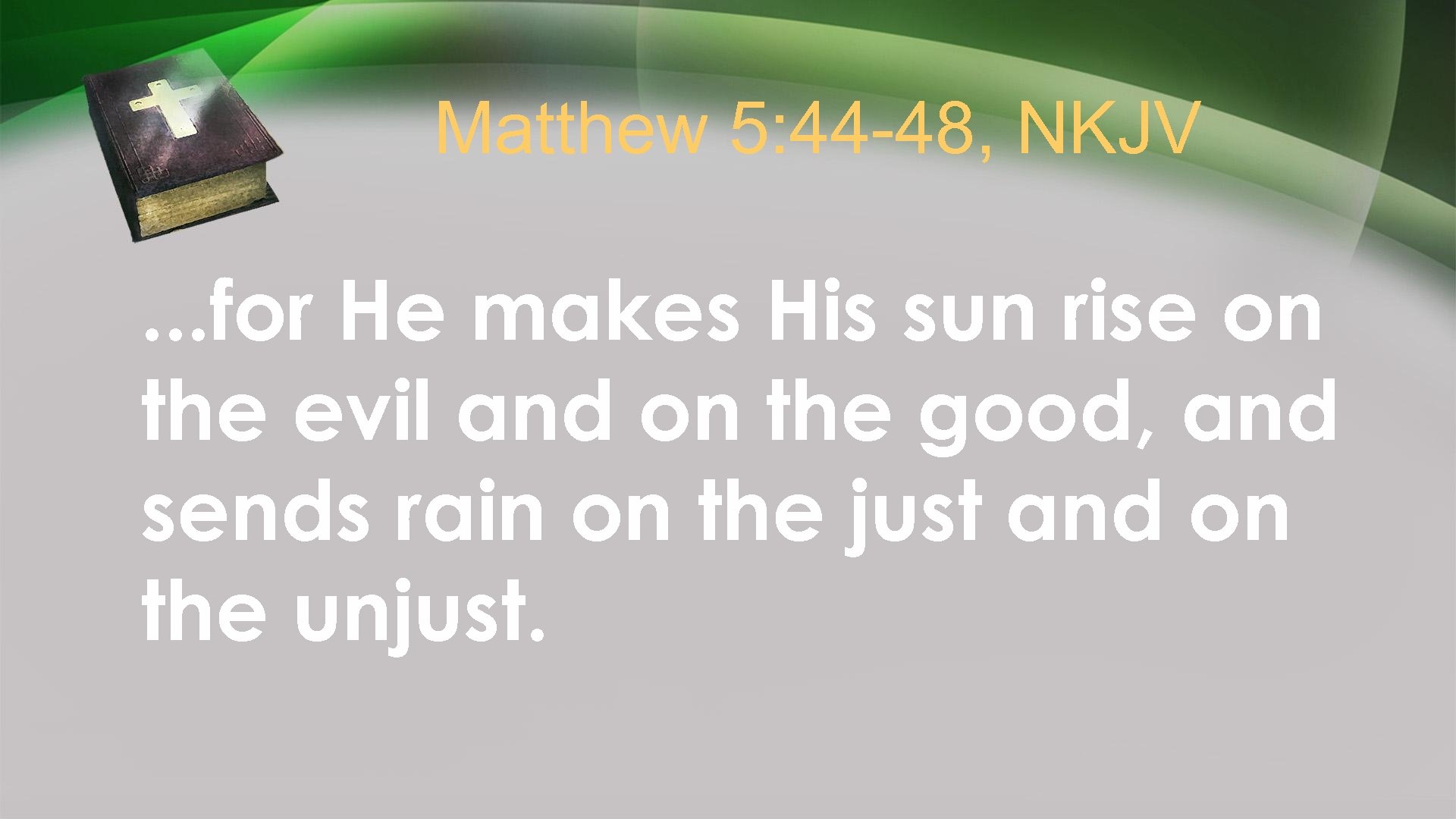 Matthew 5: 44 -48, NKJV . . . for He makes His sun rise on the evil and on the good, and sends rain on the just and on the unjust.