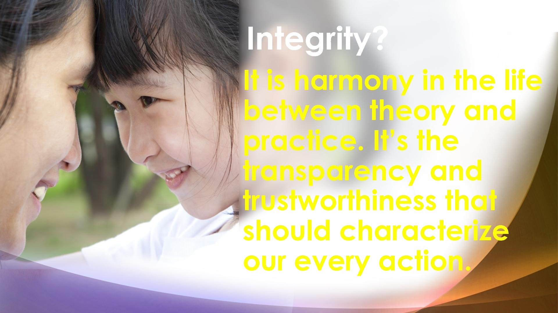 Integrity? It is harmony in the life between theory and practice. It’s the transparency and trustworthiness that should characterize our every action.