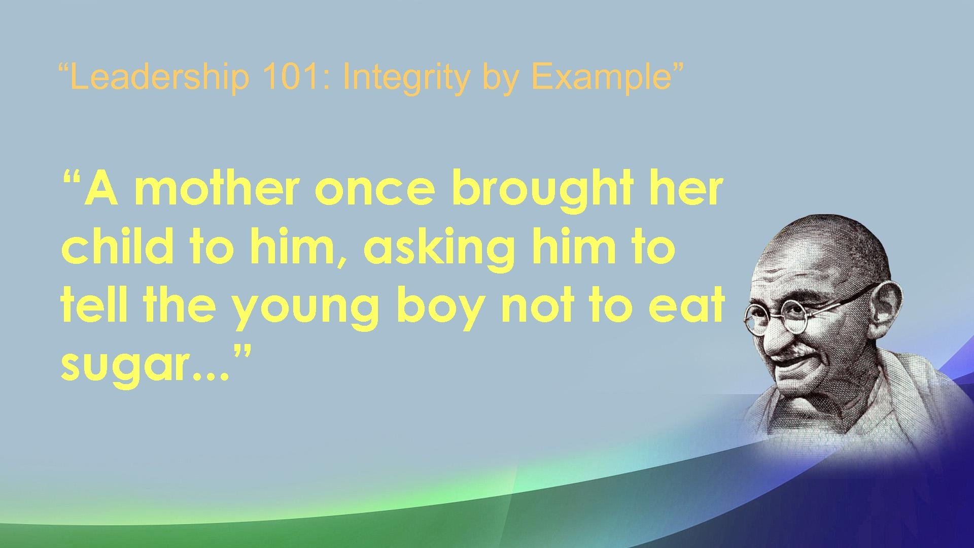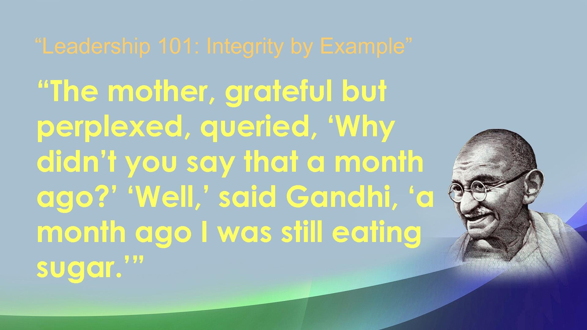“Leadership 101: Integrity by Example” “The mother, grateful but perplexed, queried, ‘Why didn’t you say that a month ago? ’ ‘Well, ’ said Gandhi, ‘a month ago I was still eating sugar. ’”