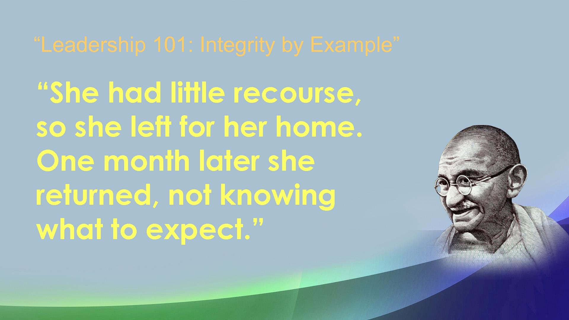 “Leadership 101: Integrity by Example” “She had little recourse, so she left for her home. One month later she returned, not knowing what to expect. ”