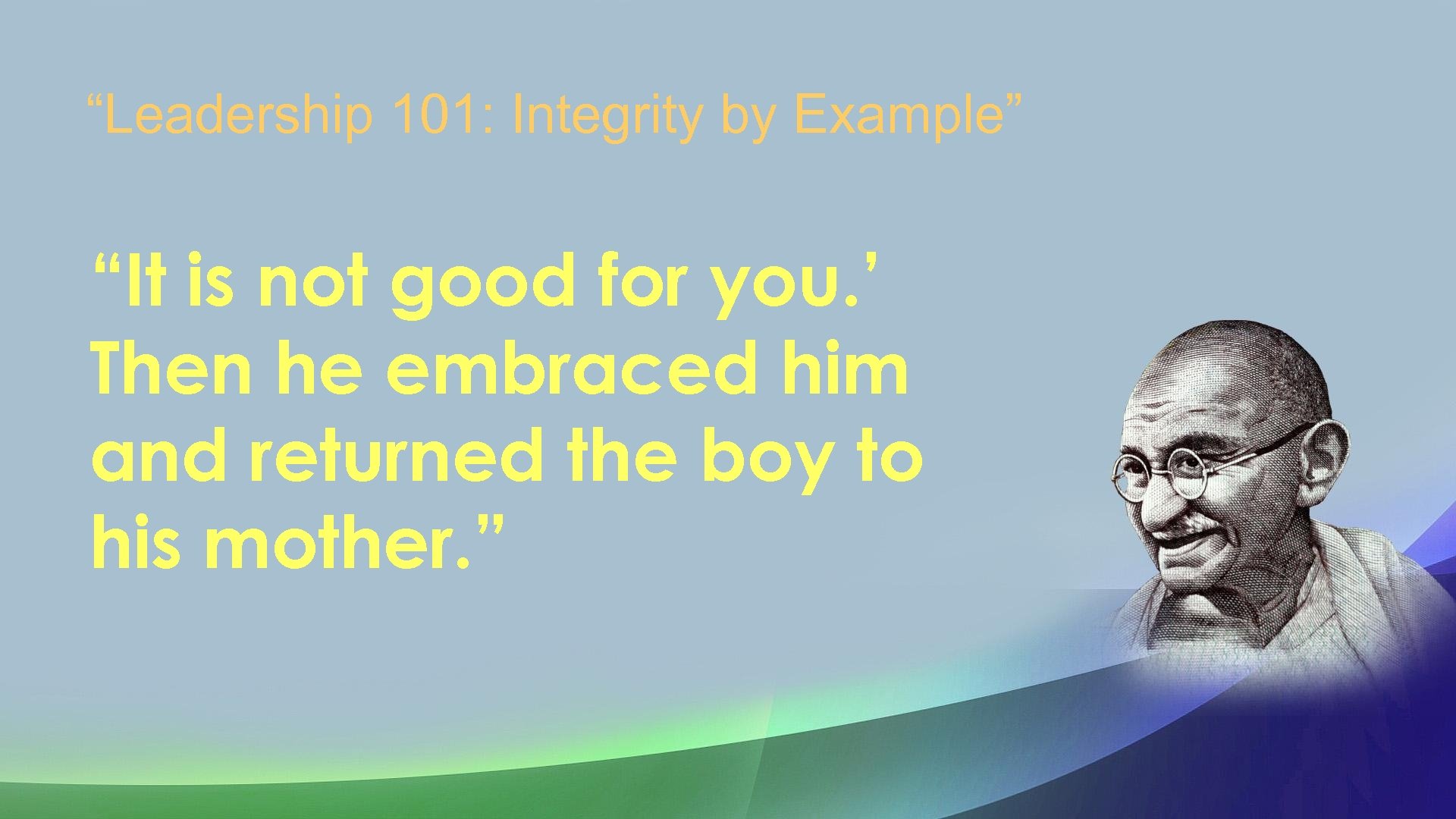 “Leadership 101: Integrity by Example” “. . . because it was not good for his diet or his developing teeth. Gandhi replied, ‘I cannot tell him that. But you may bring him back in a month. ’. . . ”