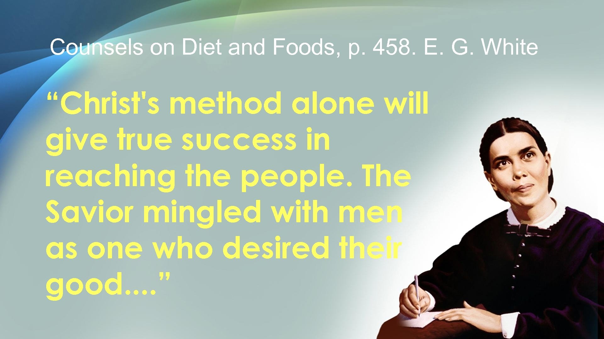 Counsels on Diet and Foods, p. 458. E. G. White “Christ's method alone will give true success in reaching the people. The Savior mingled with men as one who desired their good. . ”