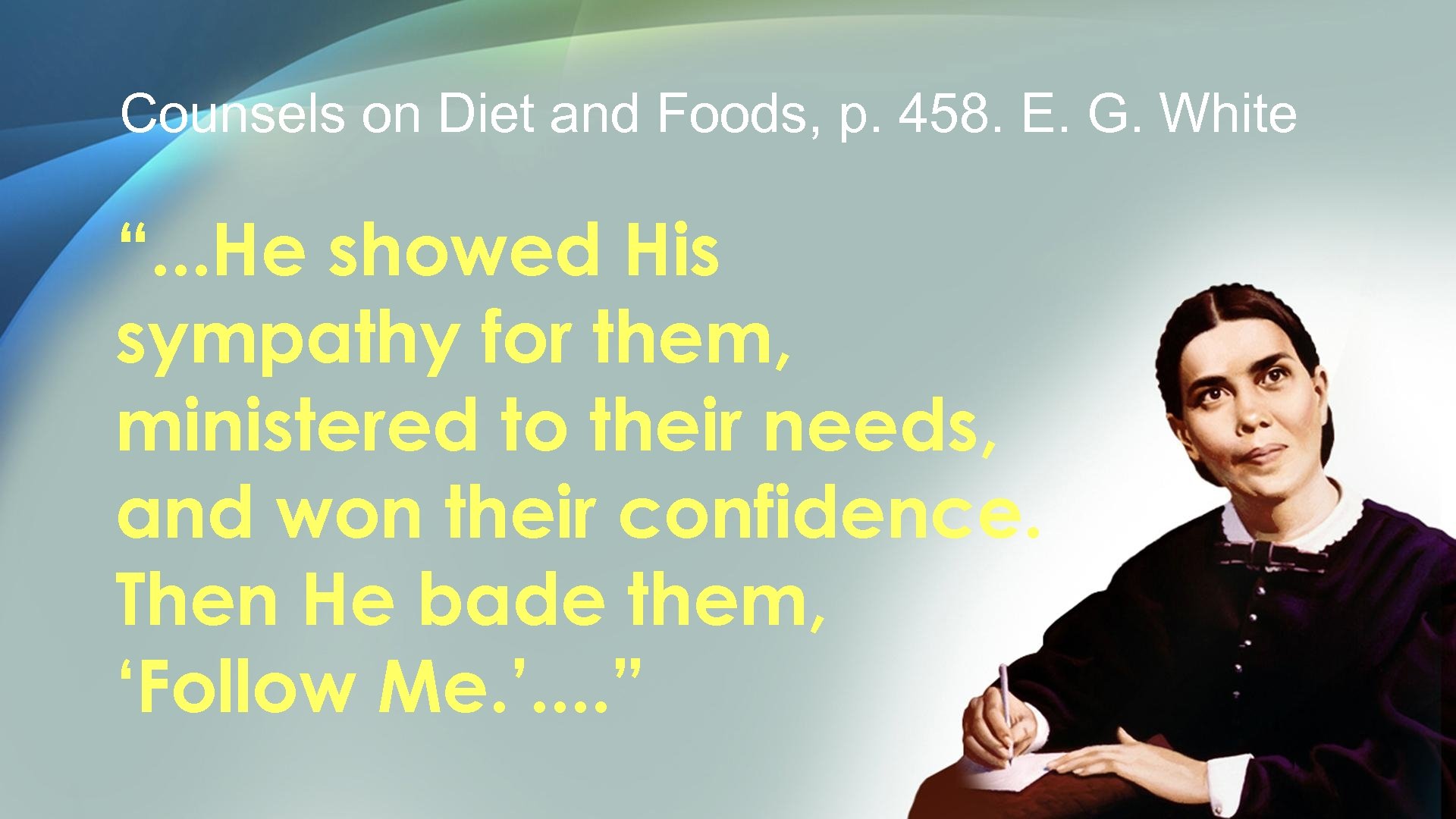 Counsels on Diet and Foods, p. 458. E. G. White “. . . He showed His sympathy for them, ministered to their needs, and won their confidence. Then He bade them, ‘Follow Me. ’. . ”
