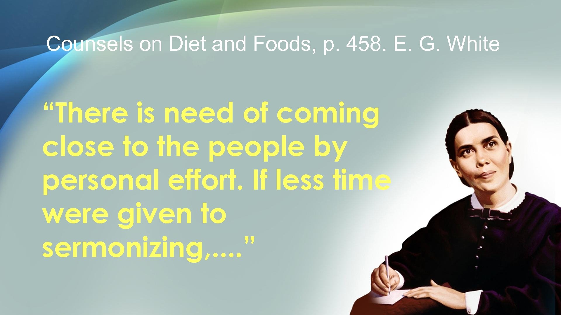 Counsels on Diet and Foods, p. 458. E. G. White “There is need of coming close to the people by personal effort. If less time were given to sermonizing, . . ”