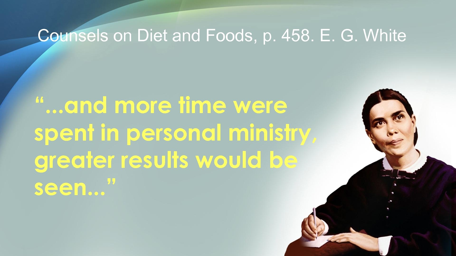 Counsels on Diet and Foods, p. 458. E. G. White “. . . and more time were spent in personal ministry, greater results would be seen. . . ”