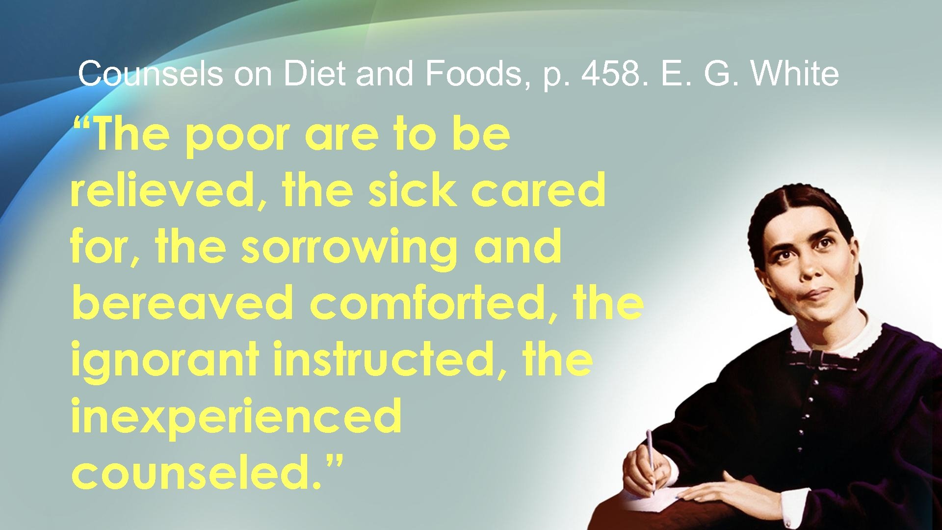 Counsels on Diet and Foods, p. 458. E. G. White “The poor are to be relieved, the sick cared for, the sorrowing and bereaved comforted, the ignorant instructed, the inexperienced counseled. ”