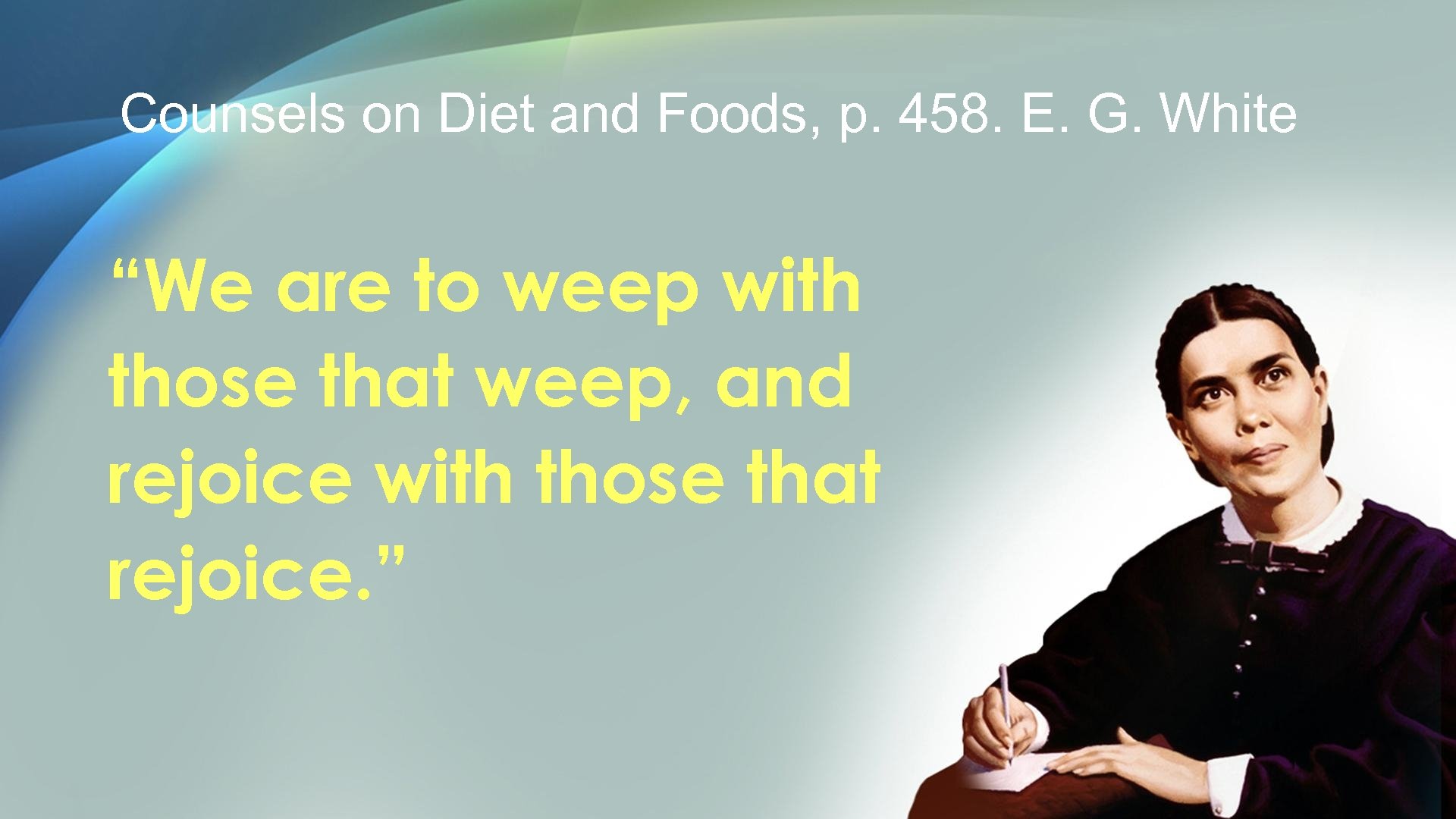 Counsels on Diet and Foods, p. 458. E. G. White “We are to weep with those that weep, and rejoice with those that rejoice. ”